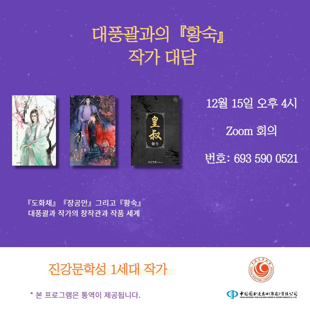 2022年12月15日,在中國(guó)作家協(xié)會(huì)的指導(dǎo)和支持下,韓國(guó)“中國(guó)文學(xué)讀者俱樂(lè)部”與中國(guó)圖書進(jìn)出口(集團(tuán))有限公司聯(lián)合舉辦了中國(guó)網(wǎng)絡(luò)文學(xué)作品分享會(huì)?;顒?dòng)邀請(qǐng)了古風(fēng)文學(xué)創(chuàng)作代表作家大風(fēng)刮過(guò),韓國(guó)青年漢學(xué)家、作家金依莎,以及當(dāng)?shù)爻霭嫒撕椭袊?guó)網(wǎng)絡(luò)文學(xué)愛(ài)好者在線參加。