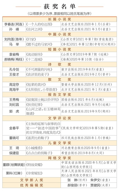 “趙樹理文學獎”是山西省最高榮譽的文學獎項,每三年評選一次,今年評選2019—2021年度“趙樹理文學獎”。12月13日召開了終評評審會,評選出11類獎項,19部(篇)獲獎作品,4位獲獎?wù)?。其中,長篇小說獎2部、中篇小說獎2篇、短篇小說獎2篇、詩歌獎2部、散文獎2部、報告文學獎3部、文學評論獎2部(篇)、兒童文學獎2部、網(wǎng)絡(luò)文學獎2部。文學新人獎2人,優(yōu)秀編輯獎2人。