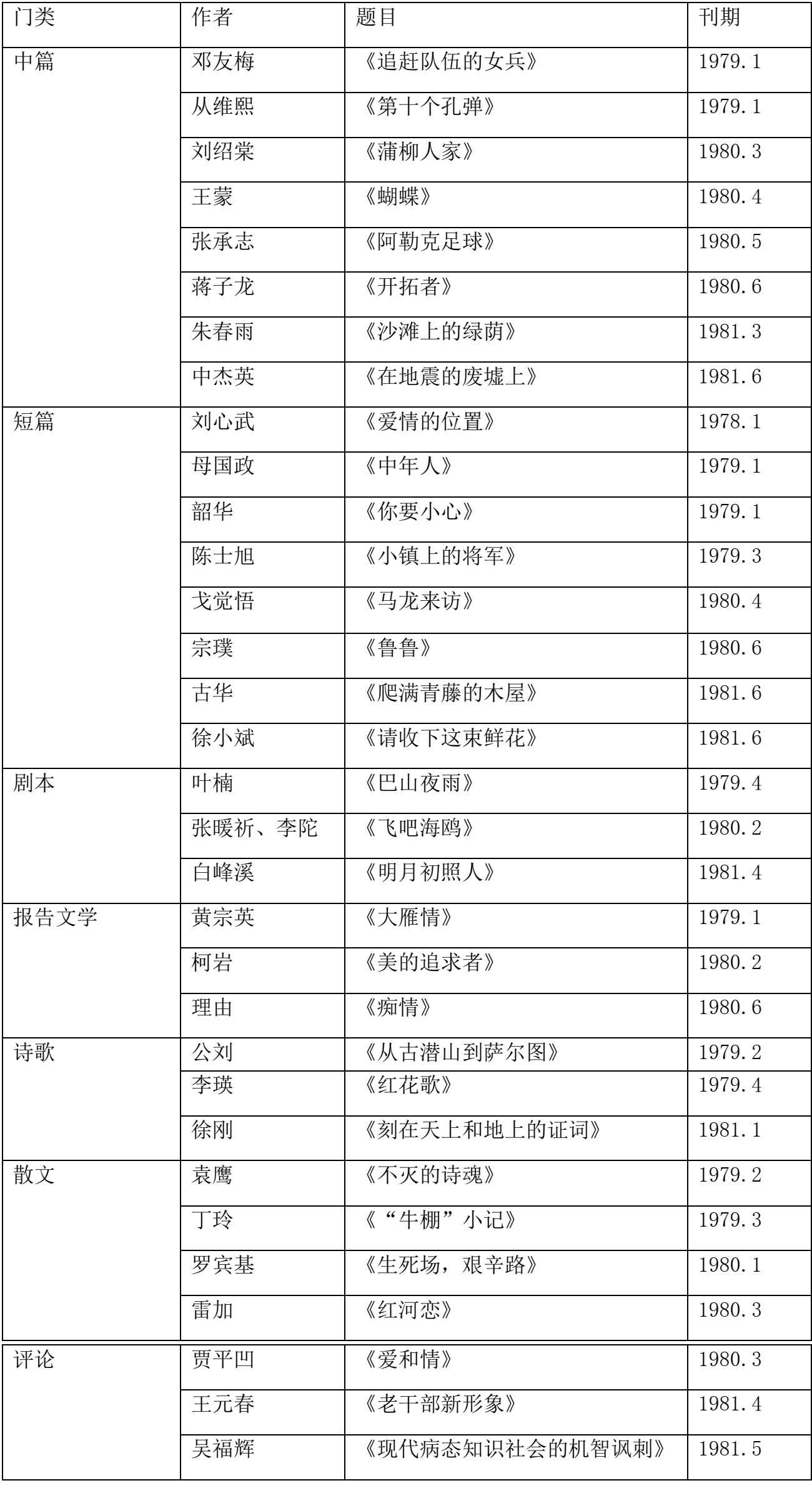 表1:首屆《十月》文學(xué)獎(jiǎng)獲獎(jiǎng)作品(1978—1981)