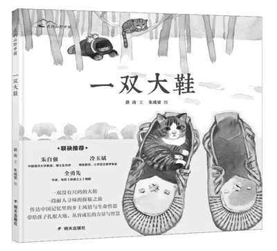 這是兒童文學(xué)作家薛濤與畫家朱成梁新近創(chuàng)作的圖畫書《一雙大鞋》的結(jié)尾。天空地白,雪道延展,兩聲“再見”里,是一段遙遠(yuǎn)的童年;兩聲“再見”里,有一份對(duì)故鄉(xiāng)的懷念之情。