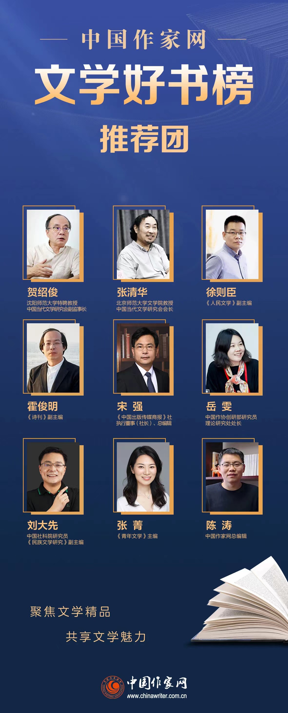 “中國(guó)作家網(wǎng)文學(xué)好書(shū)榜”評(píng)選范圍僅限文學(xué)類作品,每?jī)蓚€(gè)月評(píng)選一次。賀紹俊、張清華、徐則臣、霍俊明、宋強(qiáng)、岳雯、劉大先、張菁等深耕于文學(xué)現(xiàn)場(chǎng)的作家和評(píng)論家、媒體人,組成好書(shū)榜推薦團(tuán),以全面開(kāi)放的視野、專業(yè)創(chuàng)新的眼光,發(fā)現(xiàn)能夠涵養(yǎng)、強(qiáng)健精神的優(yōu)秀作品。我們將從出版機(jī)構(gòu)和媒體中廣泛征集參評(píng)圖書(shū),推薦團(tuán)成員在對(duì)參評(píng)圖書(shū)認(rèn)真閱讀的基礎(chǔ)上進(jìn)行定期的討論,從而評(píng)選出這兩個(gè)月內(nèi)新出版的10部?jī)?yōu)秀中外文學(xué)類圖書(shū),最終結(jié)果將以榜單的形式發(fā)布。年終,將綜合歷次推薦結(jié)果,呈現(xiàn)“中國(guó)作家網(wǎng)年度文學(xué)好書(shū)榜”。