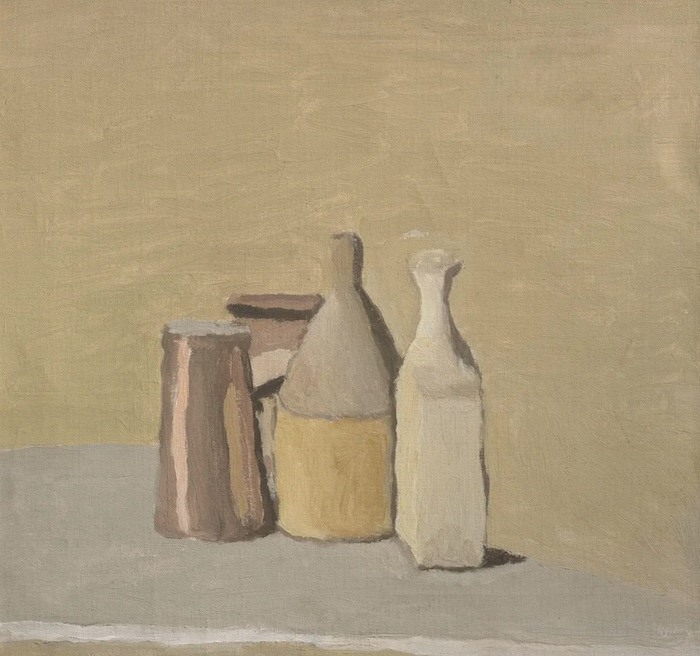 你想象下,莫蘭迪在一個(gè)安靜的早晨把這些東西從廚房的櫥柜里拿出來并擺放好。當(dāng)他在復(fù)制檸檬榨汁機(jī)、瓶子和杯子的長(zhǎng)長(zhǎng)的影子時(shí),時(shí)間停止了。不容忽視的事實(shí)是,對(duì)莫蘭迪來說——以及當(dāng)我們透過他的眼睛看時(shí)——這幅靜物畫中有一個(gè)精神之謎。這些固體物件似乎在發(fā)光。他們是沒有生命的形體,卻因幽靈般的意識(shí)而顫抖。