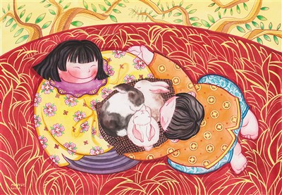 新年畫之新,不僅在主題內(nèi)容之新,也在于創(chuàng)意構(gòu)思的新穎、藝術(shù)表現(xiàn)手法的推陳出新。一些表現(xiàn)傳統(tǒng)主題的年畫作品,同樣讓人眼前一亮,呈現(xiàn)出鮮明的時代特征。今年的新作中有不少以生肖兔作為主題,比如《瑞兔呈祥》筆觸細膩,采用了裝飾藝術(shù)簡潔的表現(xiàn)形式,營造出空間感;《年年歲歲》在黃、橙、紅三色的喜慶基調(diào)中,中間添加人物手拿糖葫蘆,仿佛是喜慶年節(jié)的一次奇妙之旅,讓傳統(tǒng)抵達今天;《新生》則以迎接兔年為背景,描繪了一對母子在自然的美景中迎接一窩新生小兔的場景,畫中人物采取插畫的表現(xiàn)手法,人物和兔子都各自以圓形的輪廓進行強化,傳遞出春節(jié)的團圓氛圍和暖意融融。豐收一直是年畫的重要表現(xiàn)主題之一,豐收主題亦在今年的新作中占有相當?shù)谋戎?。比如具有顯著江南水鄉(xiāng)風格的《我們的小康生活》,采用工整細致的表現(xiàn)技法,細膩地描繪了江南古鎮(zhèn)的民居,以當?shù)厝讼矏鄣奈瑾{、舞龍、擊鼓、玩船等喜聞樂見的形式慶祝豐收,以紅色調(diào)來表達人們喜悅的心情,紅火、熱情、喜悅,讓觀者可感可知。又如表現(xiàn)時令節(jié)氣主題的作品《春風》,以獨特的俯視視角,從天空中飛舞的3只具有中國傳統(tǒng)美好寓意的風箏,俯瞰在廣場上沐浴春風的老老少少,洋溢著春天的活力與希望。