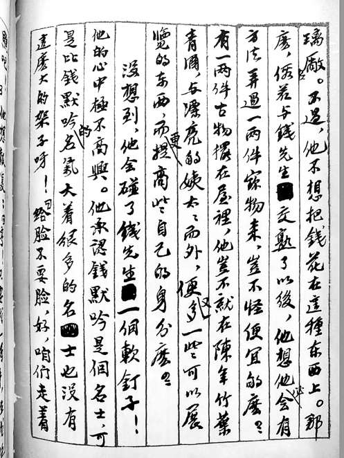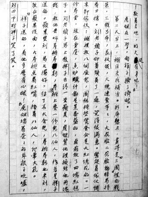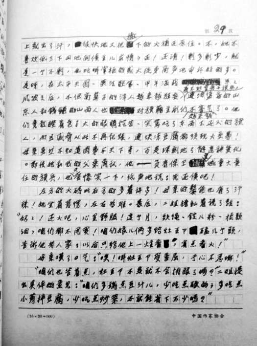 還有一點,老舍在原稿上的修琢,也并非只限于個別字句——他還成行連片甚至是成段落地“推倒重來”呢。他的辦法是沿著魯迅、周作人“精工細作”的這一路而重來的:把“推倒”那一片先橫格豎行數(shù)清楚,在另一張空白稿紙上照著剪下一塊,然后重書改文,再小心翼翼將“補丁”貼回到原行原格的位置,橫水平,豎齊線,不仔細盯著看,你幾乎發(fā)現(xiàn)不了這塊“整容”!《正紅旗下》手稿164頁,從前到后粗檢一遍,我至少數(shù)出了作者有七處這樣剪貼的痕跡。這是什么精神?是作者莊重地對待自己的作品,鄭重地呈給將來的讀者,這樣一種嚴以責己、敬以奉世的精神。稍再思之,我們的古來先賢,類似如是地留給人世間精美藝術(shù)品般的手稿,不是屢屢可見的嗎?