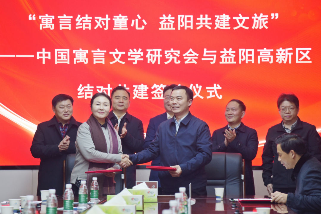 會(huì)后,還舉行了“寓言結(jié)對(duì)童心 益陽(yáng)共建文旅”中國(guó)寓言文學(xué)研究會(huì)與益陽(yáng)高新區(qū)結(jié)對(duì)共建簽約儀式。肖驚鴻、喻理科分別代表雙方正式簽約,劉益希主持簽約儀式,李曉東、汪軍、劉戈、謝樂(lè)軍、包后勇等共同上臺(tái)見(jiàn)證。雙方將積極推進(jìn)多項(xiàng)合作,開(kāi)設(shè)文學(xué)專(zhuān)題講座、建設(shè)中國(guó)寓言文學(xué)研究會(huì)兒童書(shū)屋、深入文學(xué)調(diào)研走訪、開(kāi)展寓言童話進(jìn)校園活動(dòng)、舉辦全國(guó)兒童文學(xué)類(lèi)頒獎(jiǎng)或賽事等,助力清溪村開(kāi)創(chuàng)更具辨識(shí)度的新文化,努力將中國(guó)寓言以更為豐富、嶄新的形式呈現(xiàn)在大眾面前。