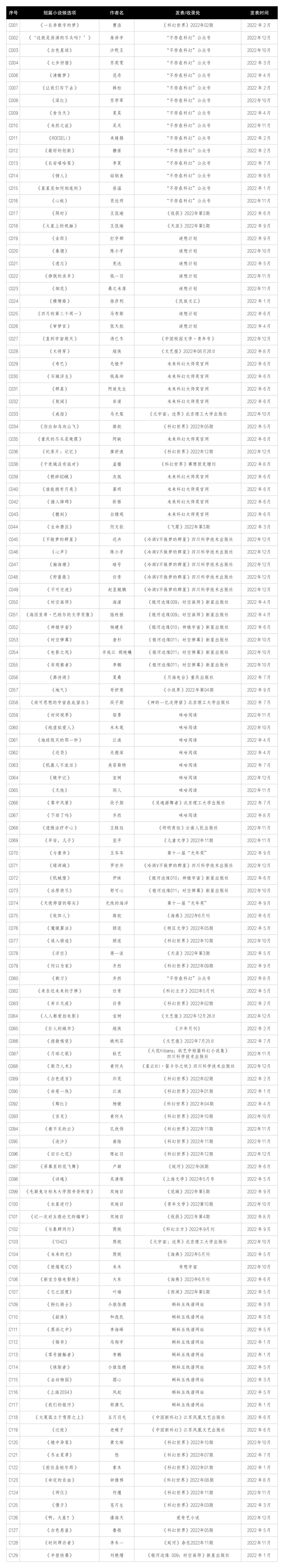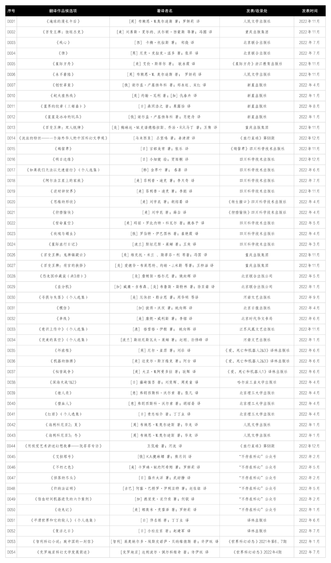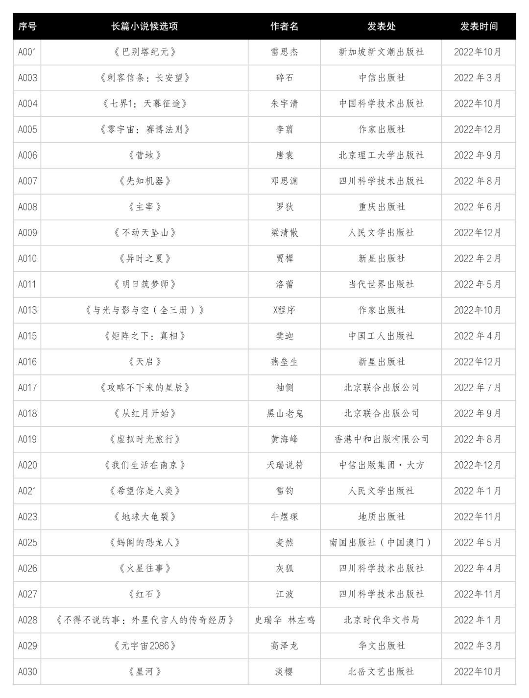 自2022年11月21日至2023年1月31日止,在第十四屆華語科幻星云獎組織委員會的領(lǐng)導(dǎo)和薦選委員會的努力下,通過廣泛傳播、組織征集和重點邀約等多種方式,收到來自各個出版社、科幻文學(xué)類別的雜志社和一些科幻類的出品機構(gòu)、非紙質(zhì)專業(yè)平臺以及作者個人的推薦和自薦參評的作品和人選,共計392項申報,其中經(jīng)查符合參評標(biāo)準(zhǔn)并通過候選資格復(fù)核的有長篇小說25項、中篇小說49項、短篇小說123項、翻譯作品51項、非虛構(gòu)作品36項、評論42項、新星獎29人(不含其他專項獎、特別獎)。