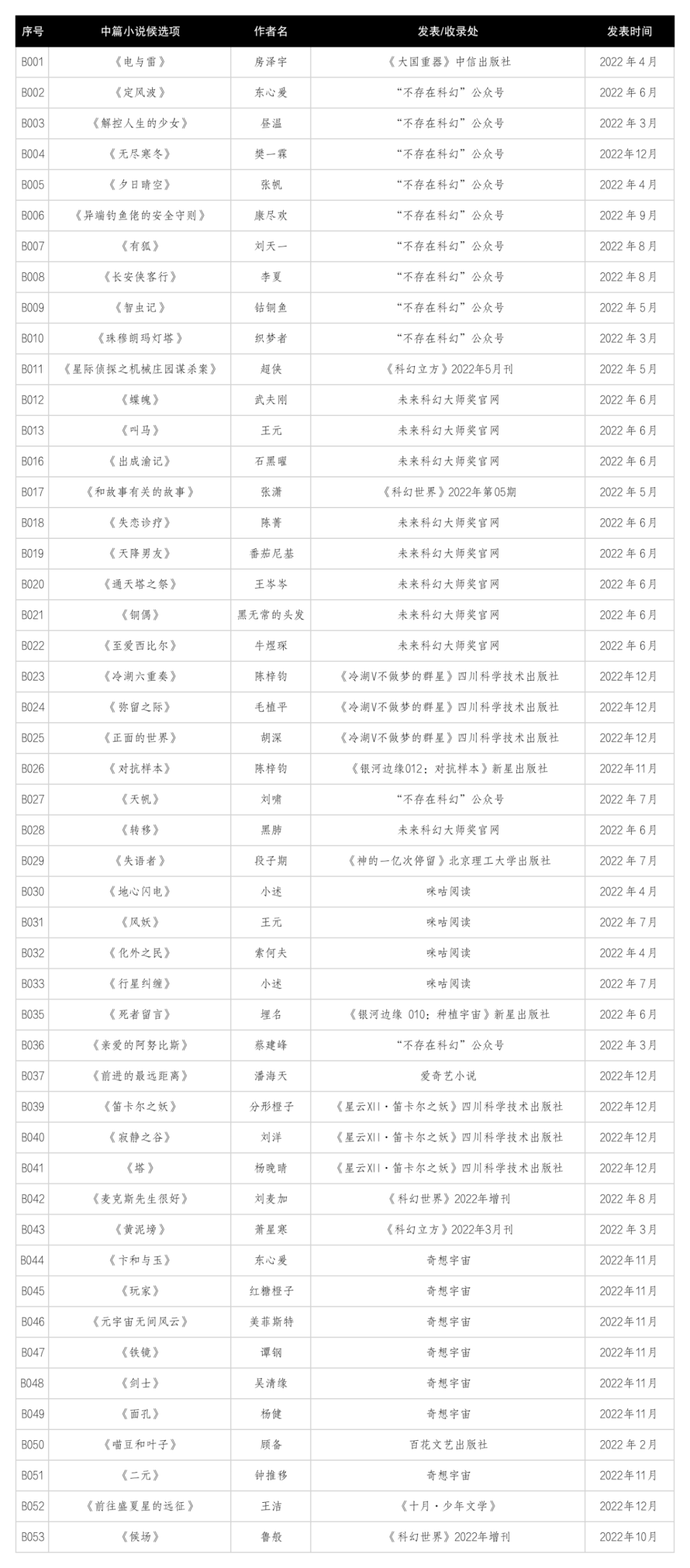 本屆獲得組織委員會資質(zhì)認證的中篇和短篇小說非紙質(zhì)專業(yè)發(fā)表平臺有八家。一部分屬于上一屆通過認證的平臺,經(jīng)過更新補充資料,繼續(xù)維持資質(zhì)認定;另一部分屬于新申請平臺,經(jīng)過復(fù)核申請資料后也通過了資質(zhì)認定,名單如下:蝌蚪五線譜;未來事務(wù)管理局“不存在科幻”微信公眾號;“八光分文化”微信公眾號和冷湖科幻文學(xué)獎;第十屆未來科幻大師獎;第十一屆光年獎;咪咕閱讀(包括《奇想》電子雜志);17K中文網(wǎng)(包括“奇想宇宙”和“謎想計劃”);愛奇藝小說。所有通過資質(zhì)認證的平臺其申報后符合參評標(biāo)準(zhǔn)并通過候選資格復(fù)核的中短篇小說已經(jīng)收入《候選參考名單》。