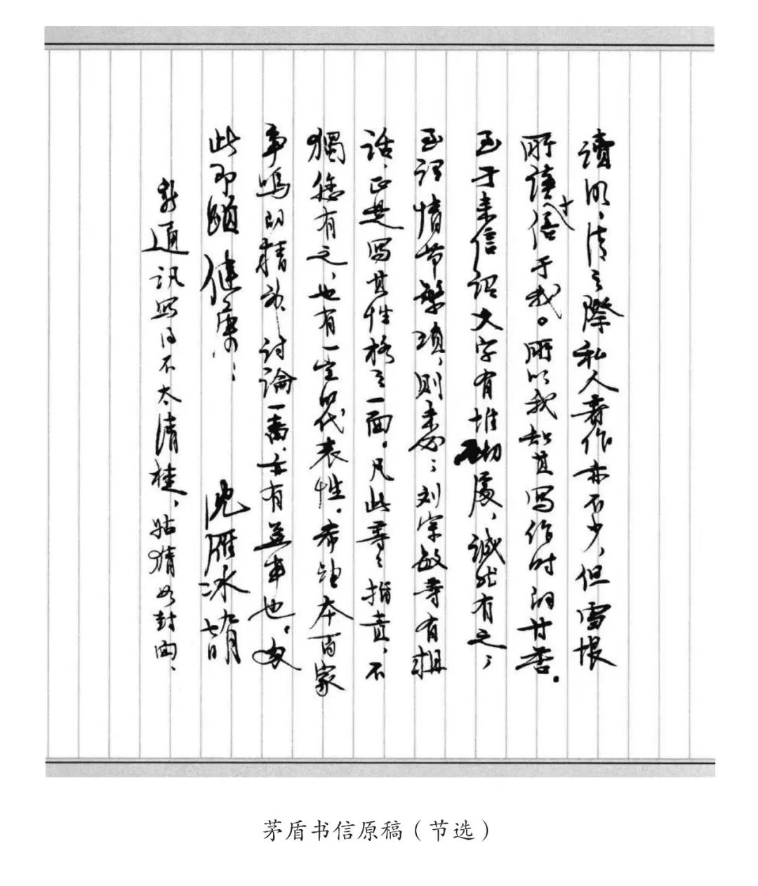 趙清閣在書信文章中也多次贊譽(yù)茅公的書法,如“您的字很像文徵明、倪瓚的,甚清秀”(1975年7月22日信),“且書法精湛、清逸之中顯蒼勁……欽佩欽佩”(1977年10月21日信),“我一直覺得您的字如其人,清逸中見功力,晚年更見蒼勁”(1977年11月7日信),“他的書法清秀飄逸,有趙孟頫的行楷韻味”(1995年《與日月兮同光》紀(jì)念文)。然而,有一篇流傳甚廣,收入《中國(guó)新文學(xué)大系(1937—1949)》、近年仍時(shí)見引述的《閑話文人書法》,卻謂“茅盾的原稿雖則清楚,但字卻寫得并不好,而且筆畫常有不到家處,以致極易被排字人認(rèn)錯(cuò),我們校對(duì)人實(shí)在不歡迎他的稿子。他的字瘦削瑣小,極像他的人體”,筆者實(shí)在不敢茍同?!堕e話文人書法》初刊《萬象》1944年1月新年號(hào),署名“賈兆明”,學(xué)界多以為是徐調(diào)孚筆名?!堕e話文人書法》視野開闊,頗多妙語卓見,但對(duì)茅盾的書法卻有其不一致和失當(dāng)處。至于說“瘦削瑣小,極像他的人體”云云,已近乎人身攻擊,有失忠厚。不知茅公有沒有寓目過《閑話文人書法》,如若知曉,而不曾撰文辯駁,則益見其雅量。