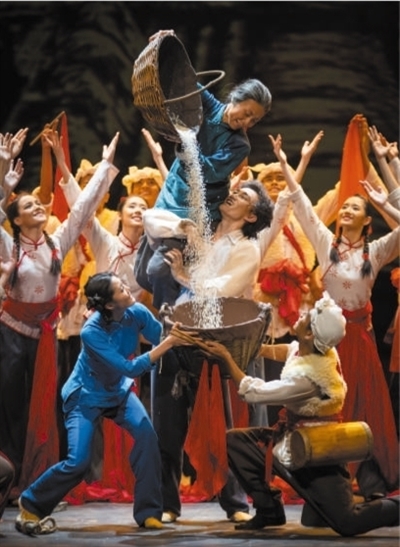 延安木刻版畫是中國美術(shù)的瑰寶。該劇用舞蹈語匯呈現(xiàn)《來了親人八路軍》《當敵人搜山的時候》《豆選》等黑白版畫作品,將版畫硬朗堅挺的線條筆觸與民間舞的氣韻風(fēng)格相結(jié)合,通過動態(tài)舞姿讓版畫“流動”起來。不少劇情來源于版畫,比如第一幕群舞“抗旱”,便是對古元創(chuàng)作于1943年的版畫《抗旱》的動人再現(xiàn)。
