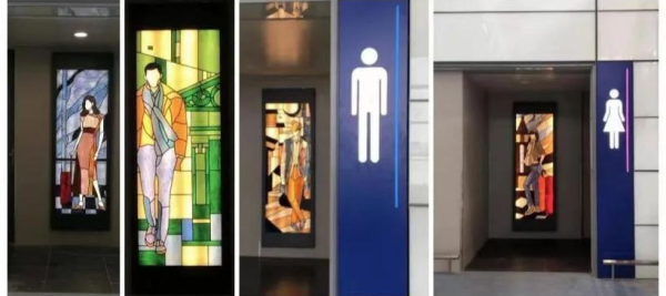 上海浦東機場衛(wèi)星廳中的衛(wèi)生間采用了彩色鑲嵌玻璃做壁畫標識
