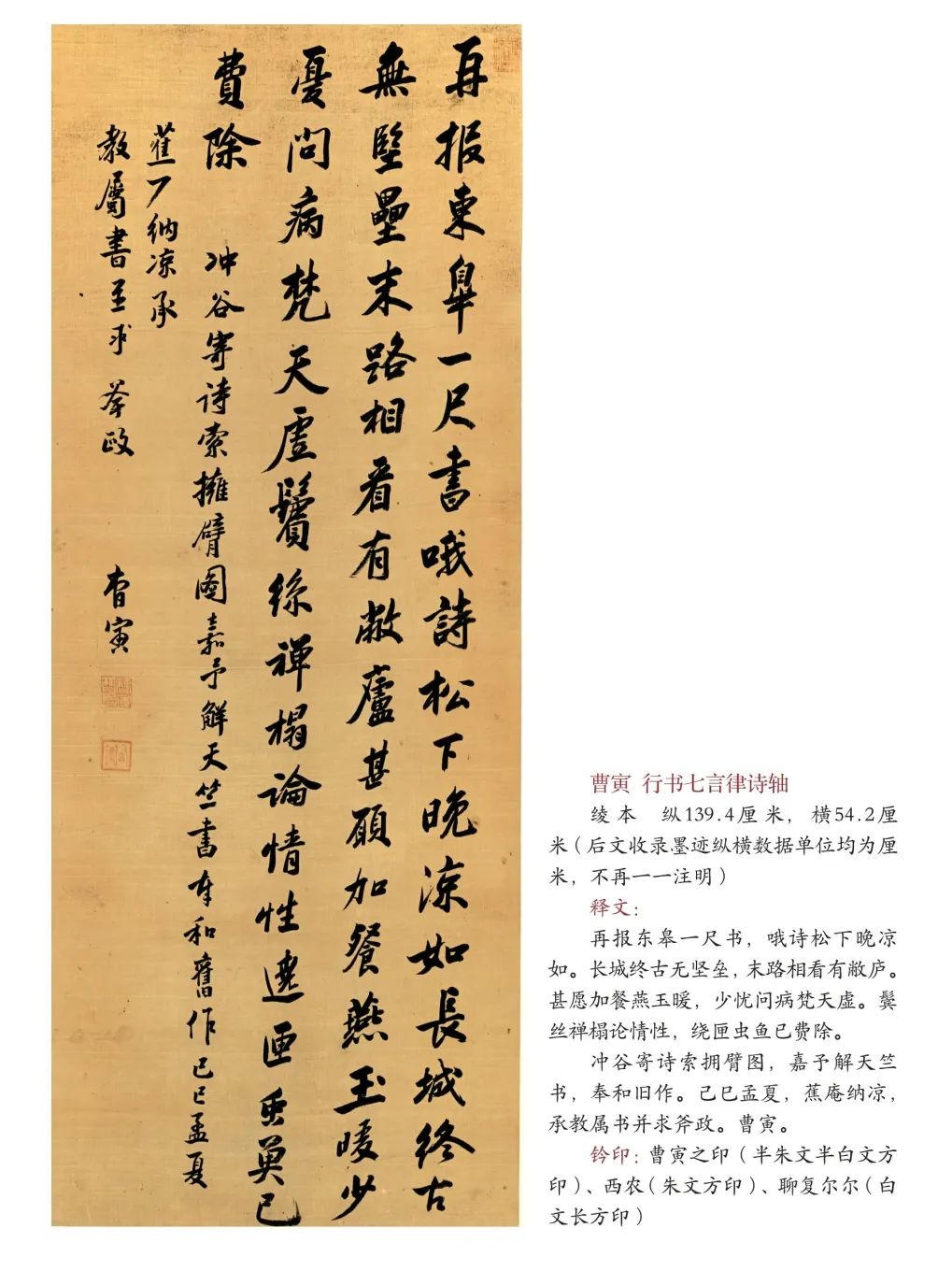 前面說過,曹寅留下的正規(guī)手書墨跡不多,這幅詩軸,系曹寅青年時期所書,工整俊秀、剛勁有力、裝裱精工,是可用于鑒別其他同類書品真?zhèn)蔚姆侗尽?/p>