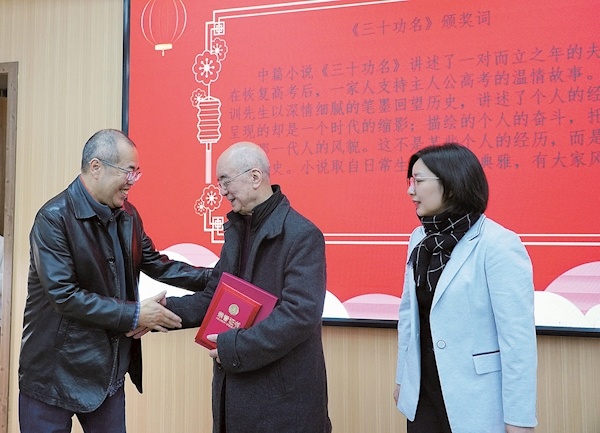 武漢市文聯(lián)黨組書記、副主席章建育(右一)與原新疆作協(xié)主席董立勃(左一),共同為中篇小說《三十功名》作者於可訓(xùn)頒獎(jiǎng) 通訊員供圖