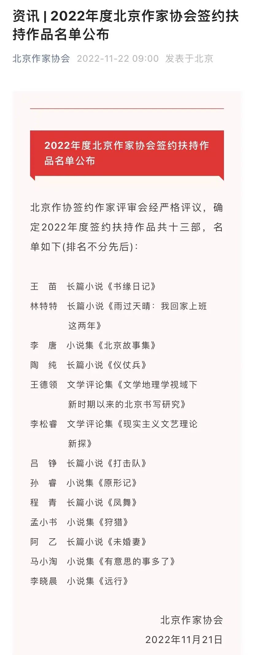 北京作協(xié)公眾號(hào)簽約名單新聞截圖