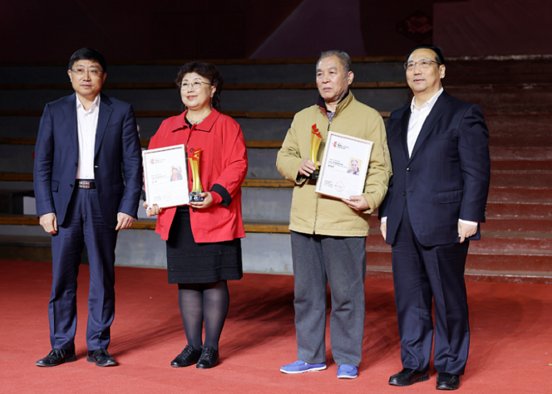 中國(guó)出版集團(tuán)有限公司總經(jīng)理常勃、副總經(jīng)理陳永剛為年度致敬作家梁曉聲、徐坤頒獎(jiǎng)
