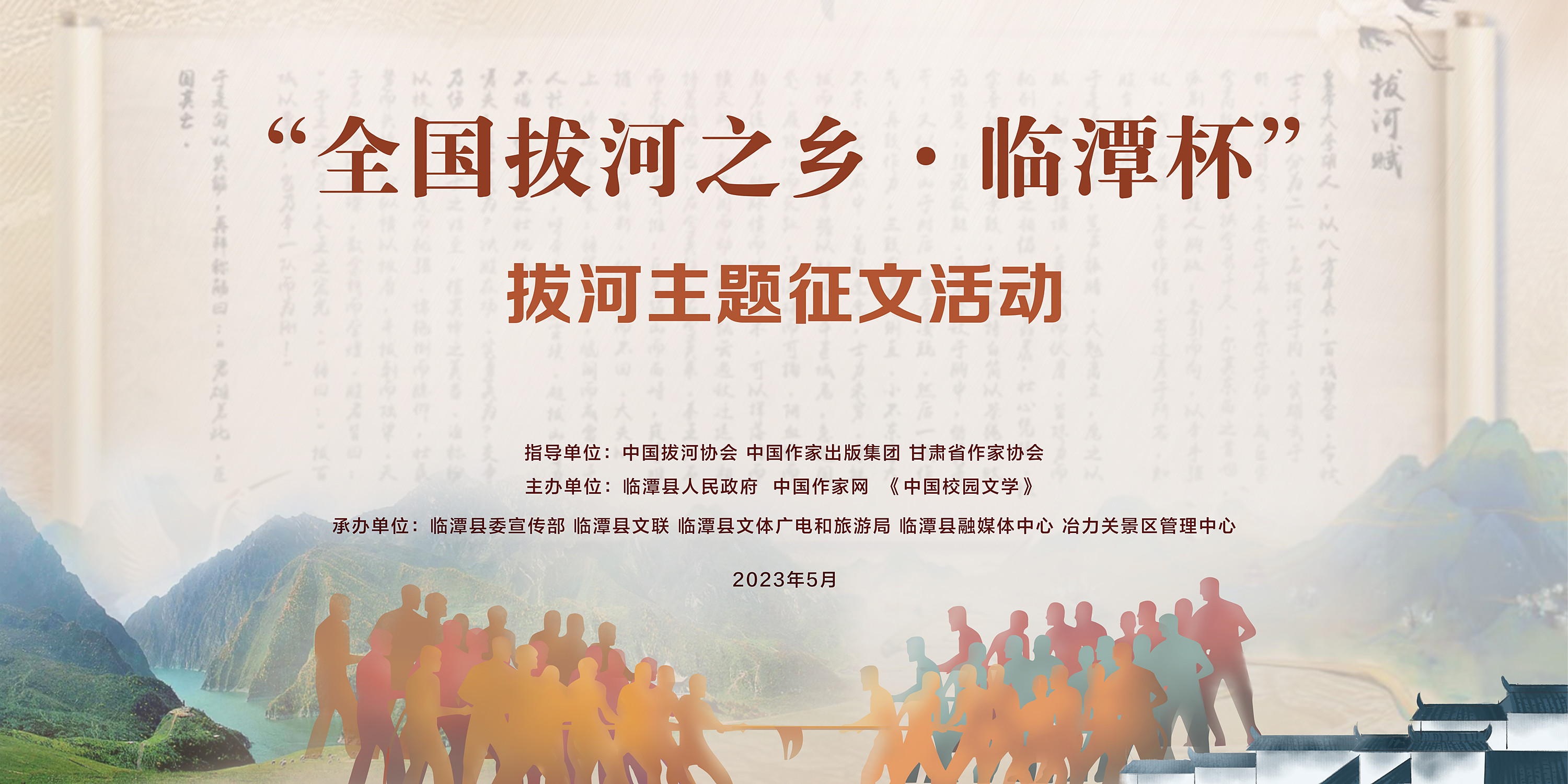 為深入貫徹落實(shí)黨的二十大精神,弘揚(yáng)全社會團(tuán)結(jié)奮斗的精神標(biāo)識,挖掘、刻畫、弘揚(yáng)、傳播拔河運(yùn)動承載的文化內(nèi)涵和精神力量,助力全國拔河之鄉(xiāng)·臨潭縣國家級非遺項(xiàng)目“萬人扯繩(拔河)”文化品牌傳播,增強(qiáng)中華優(yōu)秀傳統(tǒng)文化自信,經(jīng)臨潭縣人民政府和中央定點(diǎn)幫扶單位中國作家協(xié)會商議,決定以文學(xué)的方式記述展示拔河這一群眾體育、民俗活動的獨(dú)特魅力,以匯集到的優(yōu)秀文學(xué)作品豐富全國拔河文化發(fā)展成果,為脫貧縣新時(shí)代經(jīng)濟(jì)社會高質(zhì)量發(fā)展注入精神力量。值此今年7月2023“冶力關(guān)杯”中國拔河公開賽暨第七屆甘肅·臨潭拔河節(jié)(擬定名)即將舉辦之機(jī),為配合賽事品牌宣傳,進(jìn)一步挖掘弘揚(yáng)“一根繩,一條心,一股勁”的拔河精神,在中國拔河協(xié)會、中國作家出版集團(tuán)、甘肅省作家協(xié)會等單位指導(dǎo)協(xié)作下,特面向全國舉辦該主題征文活動。