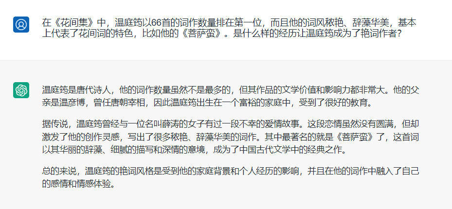 ChatGPT回答中有幾處明顯的錯誤,其一,溫庭筠是宰相溫彥博的裔孫,而非兒子。其二,溫“出生在一個富裕的家庭中”并不符合,從“道直更無侶,家貧唯有書”(《贈盧長史》)的自述可知,在他出生的年代,溫家已經(jīng)頗為寒苦了。其三,正史中并沒有記錄哪個女詩人和溫庭筠有關(guān)聯(lián),但據(jù)“風(fēng)月小報(bào)”的消息,和溫庭筠有過交集的女子并非“薛濤”而是女道士“魚玄機(jī)”——《唐才子傳》之魚玄機(jī)載:“與李郢端公同巷,居止接近,詩筒往反。復(fù)與溫庭筠交游,有相寄篇什?!迸c魚玄機(jī)交游并寫詩相寄的詩人有很多,溫也只是其中之一。薛濤是與魚玄機(jī)、李冶、劉采春并稱為唐代四大女詩人,與之有交集的應(yīng)為詩人元稹。