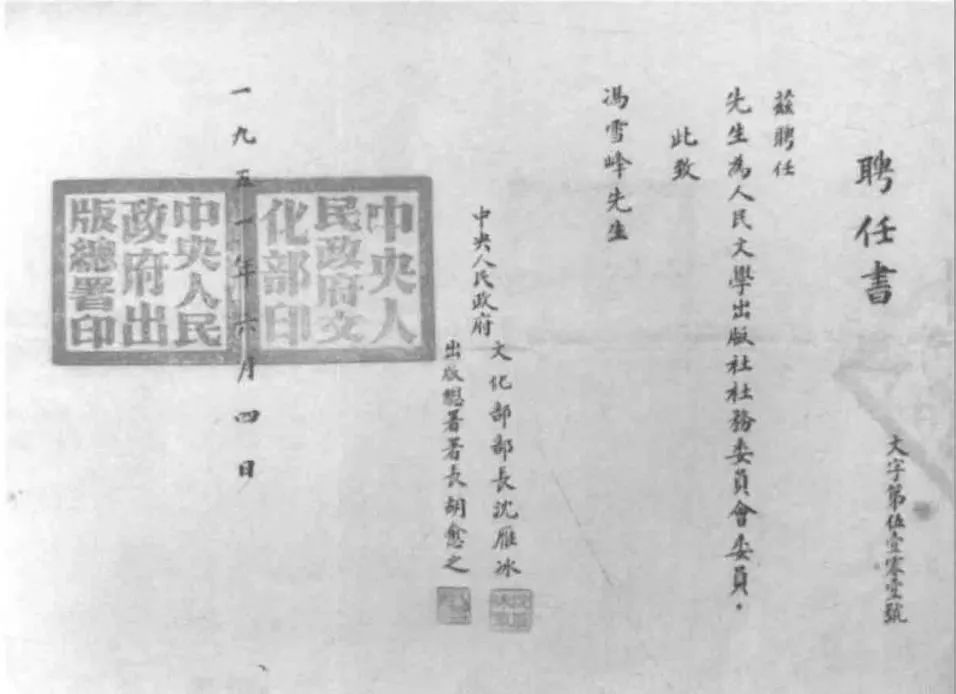 1951年6月4日,馮雪峰被中央人民政府文化部、出版總署聘任為人民文學(xué)出版社社務(wù)委員的聘任書