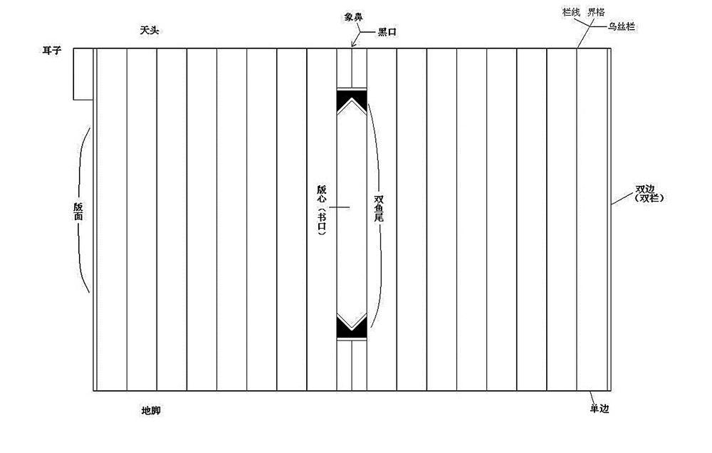 翻開古籍之后,隨之展現(xiàn)的是版框。書版四周的界限叫欄線,上方叫“上欄”、下方為“下欄”,兩邊為“左右欄”或“雙邊”,單線叫“單欄”或“單邊”,雙線叫“雙欄”或“雙邊”。行格欄線多數(shù)是黑色的,但也有朱色,以醒目區(qū)分。如明代《永樂大典》就是這樣。鑒定版本時(shí),應(yīng)特別注意行款,即版面的行數(shù)和每行的字?jǐn)?shù)。行款通常以每半頁(yè)計(jì)算,稱“每半頁(yè)若干行,行若干字”等。不同時(shí)期、不同地點(diǎn),行款往往不同。清代江標(biāo)著有《宋元行款表》用來(lái)考證版本。古籍每一版中間折縫處稱為“版心”或“書口”。書口印有黑線的稱“黑口”,不印的稱“白口”;黑線粗的稱“大黑口”,細(xì)的稱“線黑口”或“細(xì)黑口”;刻在上欄下的叫上黑口,刻在下欄上的叫下黑口。版心中間往往刻有書名、卷次、葉數(shù)。在版心下方還??逃袝伱蚩坦っO蟊侵负诳诒景嫘纳舷碌暮诰€,如同象鼻垂在胸前。版心折縫處還常??逃懈鞣N符號(hào),形似魚的尾巴,故稱“魚尾”;種類也有黑魚尾、白魚尾、線魚尾或花魚尾。
