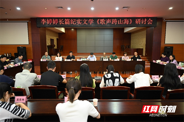 湖南省作協黨組書記胡革平出席研討會,游和平、龔旭東、謝宗玉、沈念、龔盛輝、吳雙英、胡雋宓、吳昕孺、鄧湘子等數十位文學界、評論界、教育界、出版界專家以及該書作者李婷婷,圍繞《歌聲跨山?!纷髌肺膶W性、出版價值、開拓創(chuàng)新等話題展開交流與討論。研討會由中國報告文學學會副會長、長沙市作協主席、第七屆魯迅文學獎獲得者紀紅建主持。
