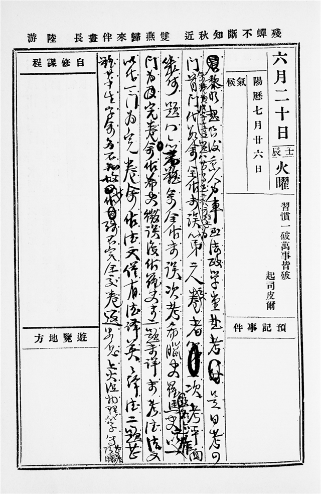 黎明起,食后乘人力車至法政學(xué)堂赴考。是日考四門,余卷為戊字十三號。首門代數(shù),題八,甚易,至二次方程止,余全作未誤,為第二人交卷者。次考平面幾何,題八,亦不難,余全作未誤。次考希臘史、羅馬史,題各六,以作一門為完卷,余作希史,微誤;復(fù)作羅史,末二題未詳。末考德法文,以作一門為完卷,余作德文,僅有德譯英、英譯德二題,甚難,其中生字余多不知,故此作殊不完全,交卷。返,略息。上火。溫物理、化學(xué)等,甚暑乃睡。