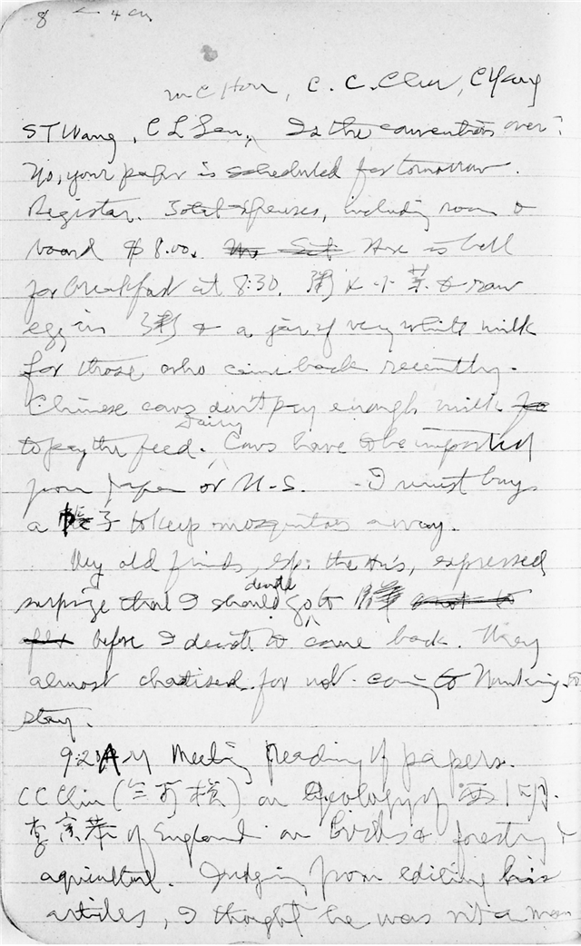 Hurrah!“中國科學(xué)社!”A beautiful gateway, two flags. Fine Bldgs. Look, who's here? MK Tang,KL Yin, MT Hu! Tunfu Hu, HC Zen, CK Huang, KF Hu, PW Tsou, MC Hu, CC Chu, C Yang, STWang, CL Lan. Is the convention over? No, your paper is scheduled for tomorrow.好哇!“中國科學(xué)社!”美麗的大門,兩面旗幟,漂亮的樓房,瞧!都是誰在這兒,MK Tang, KL Yin, 胡明復(fù)!胡敦復(fù),任鴻雋,CK Huang,胡剛復(fù),鄒秉文,MC Hu,竺可楨,楊銓,ST Wang, CL Lan?!皶h結(jié)束了嗎?”“沒有,你的論文在明天宣讀。”(本段識讀及翻譯由趙新那女士完成,第9冊內(nèi)文的英文識讀均由趙新那女士完成。)