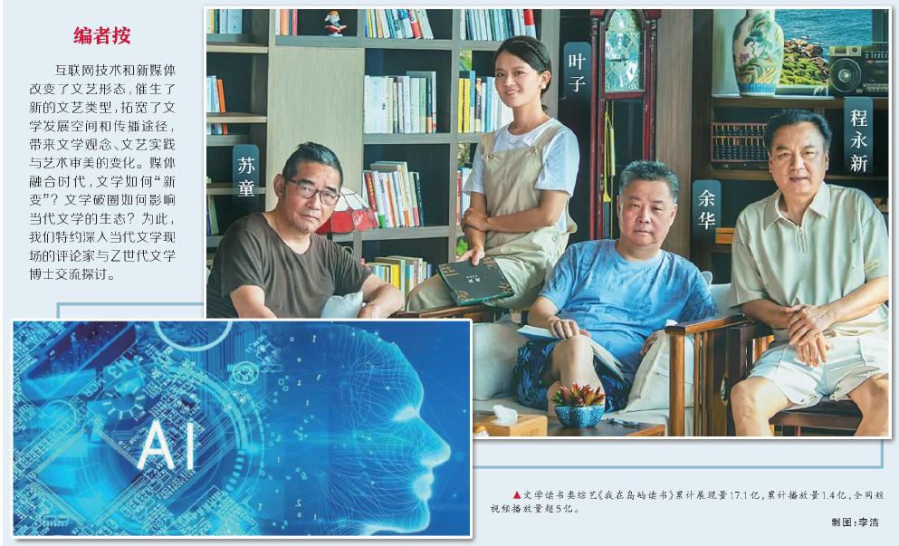 王雪瑛:2023年的春天,王安憶與余華在華東師范大學(xué)對(duì)談,不少學(xué)生連夜在取票處排隊(duì)上了熱搜,對(duì)談現(xiàn)場(chǎng)思群堂更是座無虛席,主辦方開通數(shù)個(gè)視頻號(hào)同步直播;莫言來到復(fù)旦大學(xué)與王安憶、陳思和在相輝堂對(duì)談,幾乎是復(fù)刻了“那一場(chǎng)”對(duì)談的熱度,頂流作家現(xiàn)身高校在青年學(xué)子中引發(fā)洶涌文學(xué)熱情,一直蔓延到網(wǎng)絡(luò)平臺(tái)。作為網(wǎng)絡(luò)文藝新形態(tài)的直播已與話劇、戲曲、歌劇等舞臺(tái)藝術(shù)深度融合,《網(wǎng)絡(luò)直播文藝生態(tài)報(bào)告》顯示,文化類直播同比增長(zhǎng)超過百萬場(chǎng)。文學(xué)讀書類綜藝《我在島嶼讀書》全網(wǎng)短視頻播放量超5億?!段膶W(xué)館之夜》第一期播放量超過800萬。多種文學(xué)類的電視綜藝節(jié)目,讓人耳目一新的第八屆魯迅文學(xué)獎(jiǎng)?lì)C獎(jiǎng)典禮,閃現(xiàn)在短視頻中的文學(xué)金句,文學(xué)名家與受眾的對(duì)話,網(wǎng)絡(luò)文學(xué)“日更”與讀者的互動(dòng);當(dāng)代作家小說敘事的創(chuàng)新融合,文學(xué)名刊與新媒體的聯(lián)動(dòng),對(duì)網(wǎng)絡(luò)文學(xué)、青年作家的關(guān)注等,文學(xué)作為藝術(shù)母體在媒體融合時(shí)代的多種平臺(tái)上發(fā)生“新變”,涌動(dòng)著當(dāng)代文學(xué)破圈的動(dòng)能,如何評(píng)價(jià)多種形式的文學(xué)破圈?文學(xué)破圈對(duì)當(dāng)代文學(xué)的生態(tài)有著怎樣的意義?是不是正在構(gòu)成文學(xué)生態(tài)的新特征與趨勢(shì)?