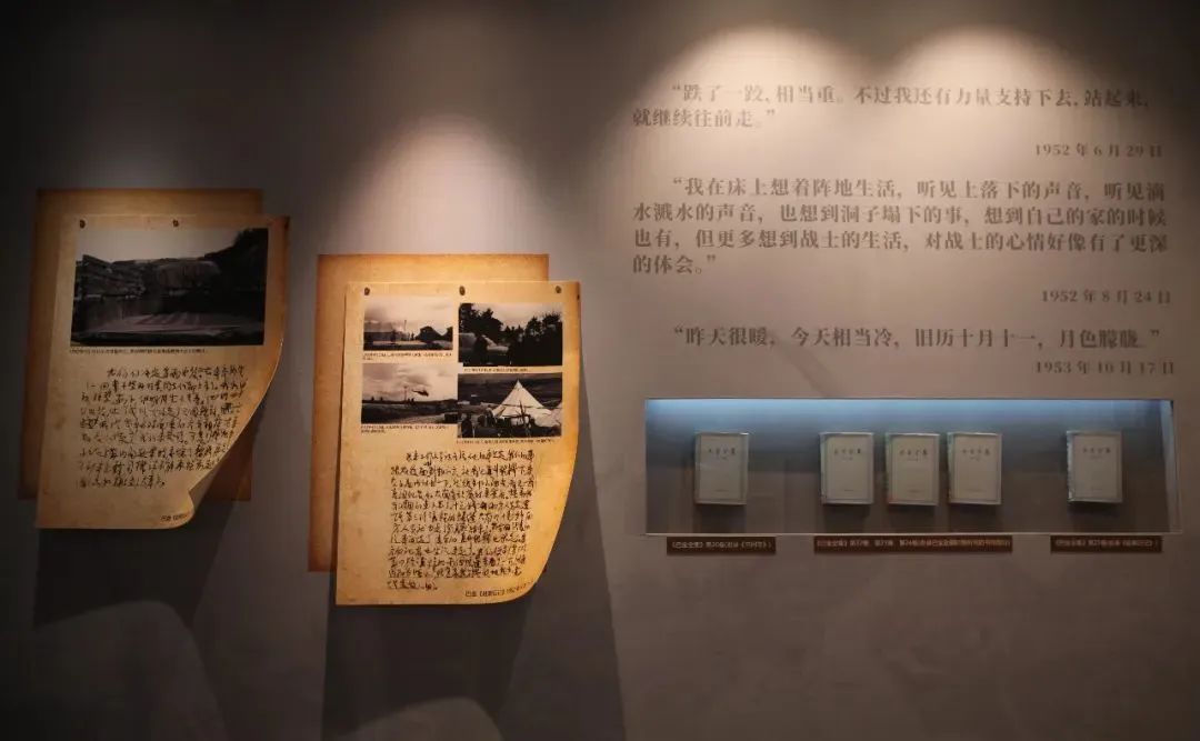 本次展覽共展出巴金的《赴朝日記》原件、魏巍的《誰是最可愛的人》手稿等233件文物,分五個(gè)單元展陳。第一單元“問蒼茫大地 誰主沉浮”,主要展示蕭三《毛澤東同志的青少年時(shí)代和初期革命活動(dòng)》《抗日軍政大學(xué)》《在棗園過年》三部著作的手稿。同時(shí)展出的還有毛澤東《浣溪沙·和柳亞子先生》原文、畫家高泉的油畫《決策出兵》等。第二單元“誰是最可愛的人”,《誰是最可愛的人》手稿亮相其中。這是作家魏巍從朝鮮戰(zhàn)場(chǎng)歸來后所著的報(bào)告文學(xué),最先于1951年4月11日在《人民日?qǐng)?bào)》刊登,后入選中學(xué)語文課本,影響了數(shù)代中國人。魏巍長篇小說《東方》手稿、自壽詩原件也一并展示。第三單元名為“英雄兒女”。“烽煙滾滾唱英雄,四面青山側(cè)耳聽……”一首蕩氣回腸的《英雄贊歌》至今仍在傳唱,而這首歌曲的出處,電影《英雄兒女》更是一代人的回憶。鮮為人知的是,這部電影是根據(jù)巴金的中篇小說《團(tuán)圓》改編而成。本單元展出了巴金的《團(tuán)圓》手稿復(fù)制件、《生活在英雄們的中間》校樣等。第四單元“上甘嶺”,展出“中國電影編劇終身成就獎(jiǎng)得主”、曾作為中國人民第二屆赴朝慰問團(tuán)成員的陸柱國的長篇小說《上甘嶺》油印修改稿。還展出了《上甘嶺》電影劇本和《林杉上甘嶺采訪筆記》。第五單元“我同祖國在一起”。本單元為群像單元,展示了黃谷柳、李蕤和舒群《赴朝日記》的原件。本區(qū)域?qū)⒆骷尹S谷柳兩次赴朝拍攝的朝鮮戰(zhàn)地寫真集錦制作成巨幅照片墻。70張照片,70個(gè)瞬間,引導(dǎo)觀眾走向歷史、走向前輩心靈、走向大時(shí)代的風(fēng)云。