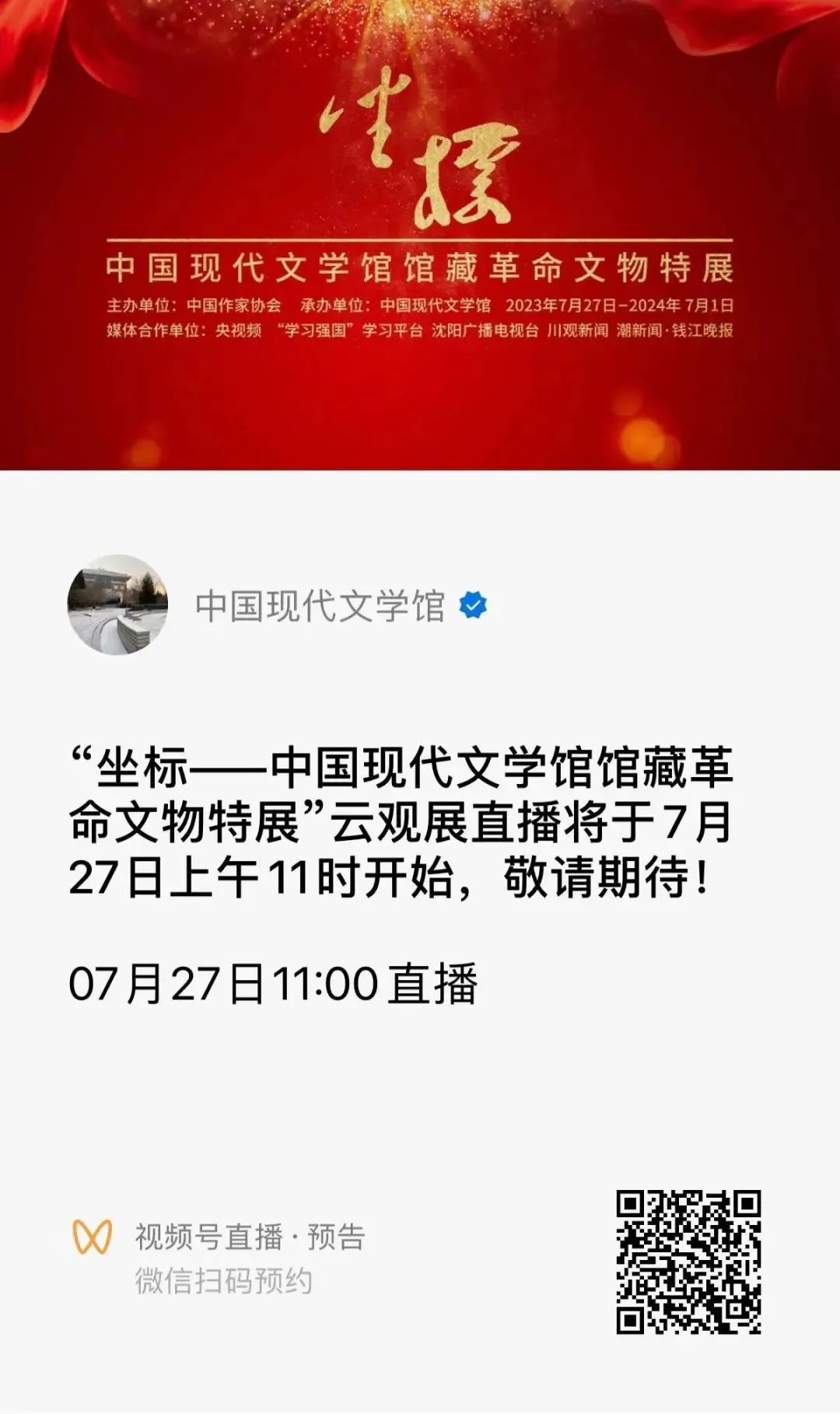 中國現(xiàn)代文學(xué)館與央視頻《品讀》聯(lián)合舉辦的探展直播將于7月27日上午11時(shí)正式開始,歡迎您觀注中國現(xiàn)代文學(xué)館微信視頻號(hào)、官方抖音號(hào)、官方快手號(hào),收看直播。