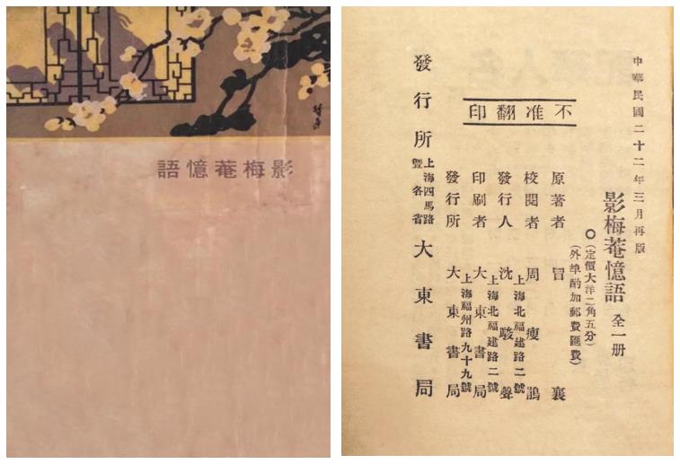 唐弢藏書《影梅庵憶語》(上海大東書局,民國二十二年再版本)封面及版權(quán)頁