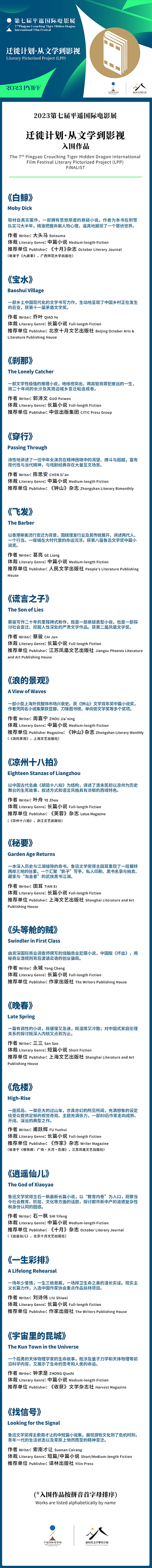 入圍作品囊括了近三年極具影視改編潛質且尚未進行任何影視化開發(fā)的文學精品,以中、長篇小說為主,涵蓋懸疑、喜劇、犯罪、科幻、愛情、歷史等多種類型。