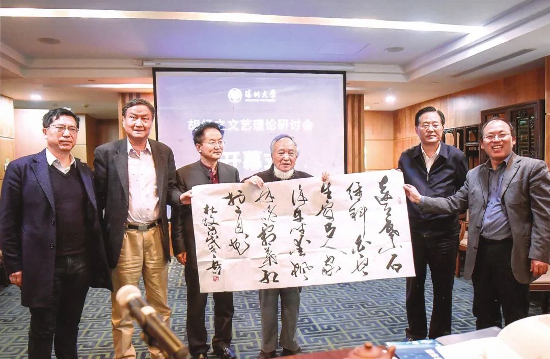 2018年,深圳舉辦《胡經(jīng)之文藝?yán)碚摗费杏憰?huì)師生重聚,王岳川獻(xiàn)上“文化書(shū)法”。從左至右依次為:王列生、王坤、王岳川、胡經(jīng)之、張首映、李健(本文作者)
