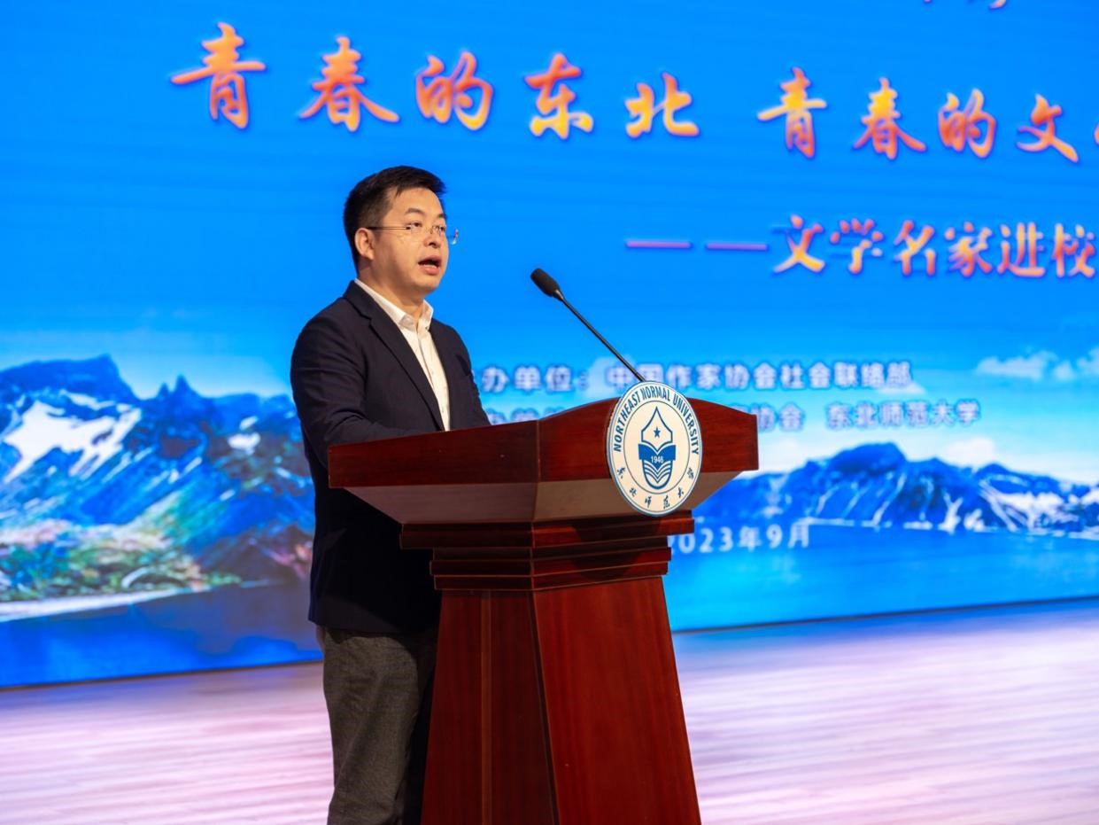 鄧凱在致辭中表示,中國(guó)作家“文學(xué)周”是中國(guó)作協(xié)公共服務(wù)領(lǐng)域的重要品牌,有利于促進(jìn)文學(xué)的推廣和普及,更好滿足人民群眾精神文化生活新期待。期待同學(xué)們通過(guò)聆聽(tīng)文學(xué)名家的分享,充分領(lǐng)略到文學(xué)風(fēng)光和青春圖景,對(duì)當(dāng)下和未來(lái)產(chǎn)生新的認(rèn)識(shí)和思考。鄔志輝談到,文學(xué)是屬于青春、屬于青年的,青春和青年象征著“周雖舊邦,其命維新”的朝氣、活力和創(chuàng)造精神,期待這種精神能夠推動(dòng)真正意義上的“東北文藝復(fù)興”。王春雨回顧了東北師大中文的優(yōu)良傳統(tǒng),介紹了文學(xué)院尤其是創(chuàng)意寫(xiě)作專(zhuān)業(yè)的辦學(xué)特色,并表示此次活動(dòng)將對(duì)文學(xué)院的學(xué)科建設(shè)和人才培養(yǎng)發(fā)揮重要助推作用。
