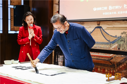 中國(guó)藝術(shù)研究院原院長(zhǎng)連輯現(xiàn)場(chǎng)揮筆撰寫“中國(guó)”二字,與到場(chǎng)嘉賓共創(chuàng)五彩長(zhǎng)卷, 預(yù)?!吨袊?guó)》第三季開播。