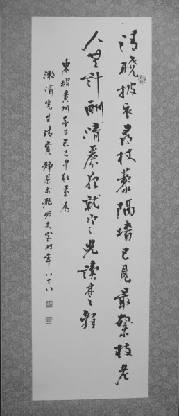 最令我喜出望外的是,1989年秋,臺先生主動為我題寫了一個條幅,題為蘇東坡七律《黃州春日雜書四絕之一》:“清曉披衣尋杖藜,隔墻已見最繁枝。老人無計(jì)酬清麗,猶就寒光讀《楚辭》?!秉S州即當(dāng)下的湖北省黃岡。1079年,蘇東坡因政治冤案被放逐黃州,整整呆了四年。繁花似錦的春晨原是清麗美好的,但蘇東坡心情郁結(jié),沒有辦法欣賞,只能在冰寒交加的心境中讀《楚辭》以抒憤懣。臺先生退休后,開過書法展,作品有潤格,一搶而空,我當(dāng)然不會隨便開口索字。事后深思,他特題寫蘇東坡的這首七律,我認(rèn)為是他想讓我及他在大陸的老友了解他在臺灣的心境,有跟蘇東坡被貶黃州的心境相類比的成分。作品選擇了臺先生最擅長的行書。他當(dāng)年雖已八十八歲,但仍筆力勁健,渾樸老辣,布局舒朗,自然天成,實(shí)為書法作品中的佳品。