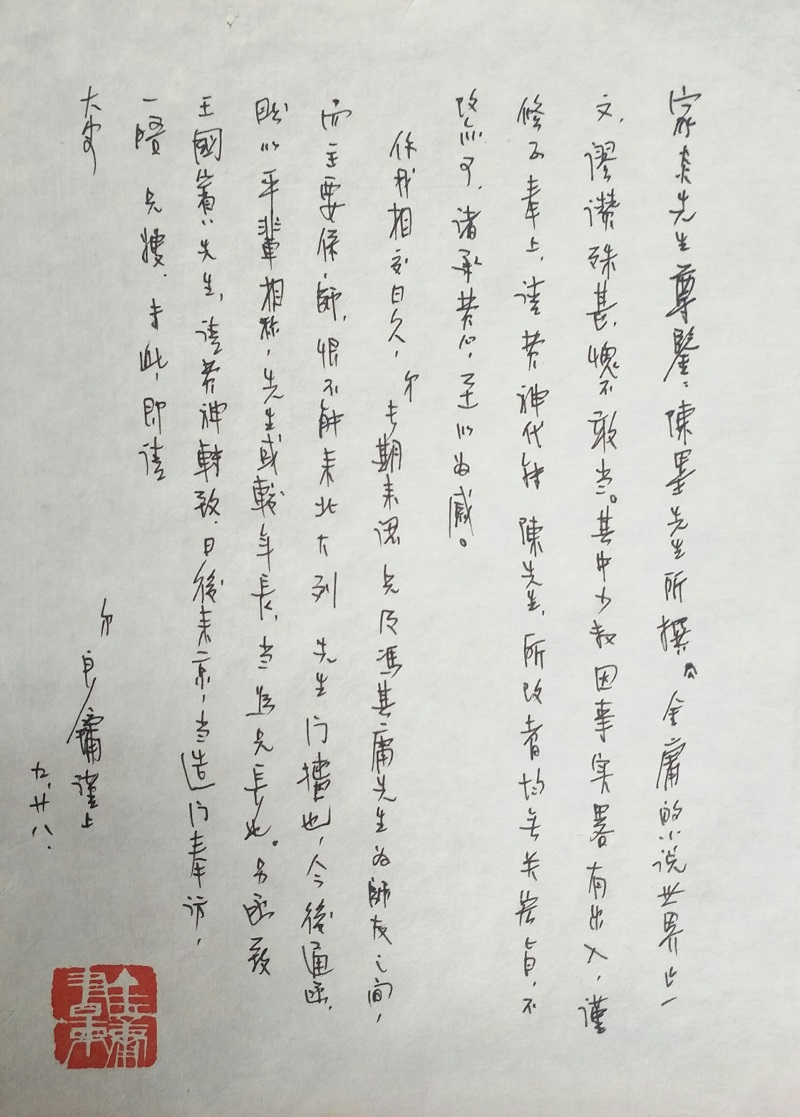 你我相交日久,弟長(zhǎng)期來(lái)認(rèn)兄及馮其庸先生為師友之間,而主要系師,恨不能來(lái)北大列先生門(mén)墻也,今后通函,盼以平輩相稱,先生或較年長(zhǎng),當(dāng)為兄長(zhǎng)也。另函致王國(guó)賓先生,請(qǐng)費(fèi)神轉(zhuǎn)致。日后來(lái)京,當(dāng)造門(mén)奉訪,一晤兄嫂,專此,即請(qǐng)