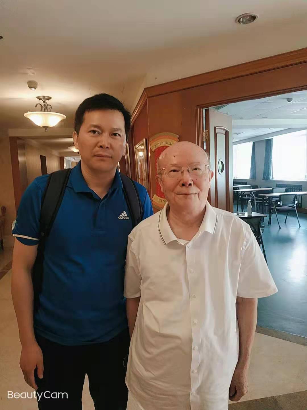時(shí)間在交談中飛快得流逝,一轉(zhuǎn)眼一個(gè)半小時(shí)過(guò)去了,我知道嚴(yán)先生一會(huì)兒還要參加這里合唱團(tuán)的活動(dòng),雖感覺(jué)談得還不盡興,但也不敢太多打擾。我和嚴(yán)先生約定下次我早點(diǎn)來(lái),早點(diǎn)聊。先生和盧老師笑著同意此建議。先生送我到會(huì)客室門(mén)口時(shí),我向先生提了一個(gè)小小“請(qǐng)求”,我能否與先生合個(gè)影?先生痛快地說(shuō):“沒(méi)問(wèn)題。你看我們站在那里照合適?”盧老師建議我們就站在門(mén)口照就可以。