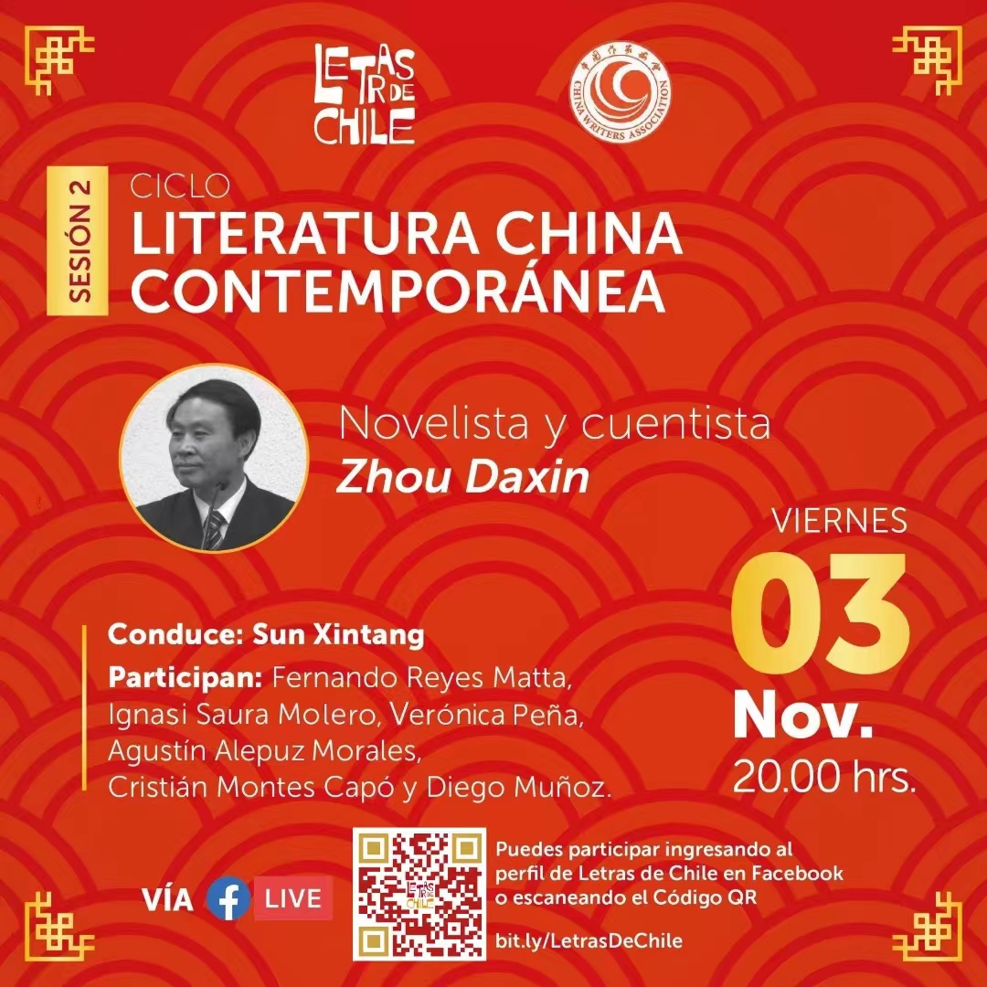 11月3日,由中國作協(xié)外聯(lián)部指導(dǎo),智利“中國文學(xué)讀者俱樂部”及智利文學(xué)網(wǎng)聯(lián)合舉辦的周大新作品《首次喚醒》西班牙文版分享會在線上舉行。作家周大新,智利前駐華大使、智利“中國文學(xué)讀者俱樂部”負(fù)責(zé)人、安德烈斯貝略大學(xué)中國研究中心主任費爾南多·雷耶斯·馬塔,智利文學(xué)協(xié)會主席、著名作家迭戈·穆尼奧斯·瓦倫蘇埃拉,西班牙漢學(xué)家夏海明,智利大學(xué)文學(xué)系教授、評論家克里斯蒂安·蒙特斯參與討論,北京語言大學(xué)拉丁美洲研究中心主任孫新堂主持,300多位智利讀者通過臉書、優(yōu)兔等平臺在線參加。