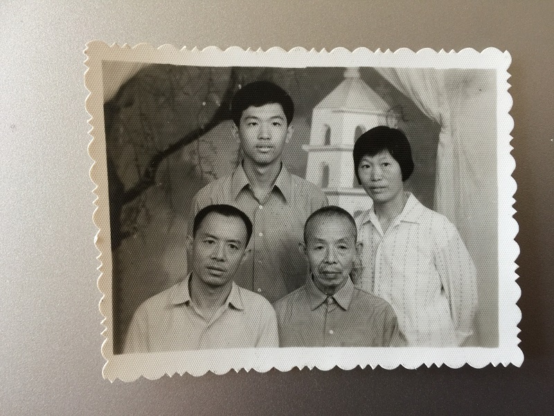 少年鐘揚(yáng)(后排左)與母親王彩燕(后排右)、父親鐘美鳴(前排左)、爺爺鐘先陸(前排右)合影)
