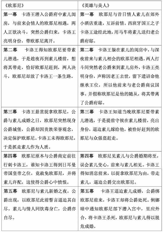 改變最大的部分在于故事結(jié)尾。在原版中,卡洛王對(duì)權(quán)勢(shì)的野心勝過(guò)對(duì)素兒的追求,所以當(dāng)他得到日耳曼帝國(guó)皇帝之位后,或許是出于瓦解反叛敵對(duì)力量的目的,當(dāng)場(chǎng)宣布赦免歐那尼,恢復(fù)其貴族身份,并將素兒許配給他。歐那尼和素兒都喜出望外。最終,是懷恨在心的老公爵用此前歐那尼的誓言前來(lái)相逼,使二人雙雙殉命,以悲劇結(jié)束。而越劇版將矛盾的焦點(diǎn)集中于卡洛王,改為老公爵綁了歐那尼獻(xiàn)給卡洛王,以交換素兒,但卡洛王反悔,反將公爵送上斷頭臺(tái)。幸虧俐娜聯(lián)絡(luò)了歐那尼的部下,雙方里應(yīng)外合,成功推翻了卡洛王。歐那尼和素兒得以脫危成婚。這個(gè)接近于起義軍推翻暴君的情節(jié)設(shè)置,固然可能受到了50年代初期創(chuàng)作傾向的影響,但從另一方面來(lái)說(shuō),它也以一種中國(guó)觀(guān)眾所熟悉的情節(jié)替代了原作中復(fù)雜的宮廷斗爭(zhēng)背景,避免觀(guān)眾的注意力被分散,使他們可以將關(guān)注點(diǎn)集中于人物間的情感糾葛。