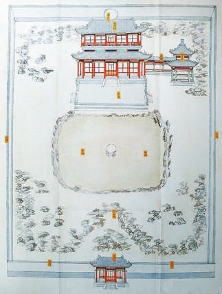 玲峰石上除了乾隆的御制詩外,還鐫滿了內(nèi)翰詞臣恭和的詩篇。閣前矗立巨石為文源閣獨(dú)有之景,乾隆留下了連篇累牘的詠石之作,其中贊道:“一峰峙我文源閣,育秀通虛映萬卷”。池南是由太湖石堆疊的縱貫東西的假山,在假山西面有一四方亭,名曰“趣亭”,東面與其相對之處筑有一平臺,上書“月臺”,均為乾隆御書。其南即為三楹宮門,入宮門后或穿過曲折的山洞,或經(jīng)過崎嶇的蹬道,再繞過水池,就可到藏書閣前。藏書閣之北的后院中也有一座假山,體量較前院的假山為小,如同屏風(fēng)般掩蔽著院墻上的月洞門,給人以靜謐幽深之感。閣之東側(cè)有單檐駝峰頂黃琉璃瓦御碑亭一座,內(nèi)有乾隆御書《文源閣記》碑。