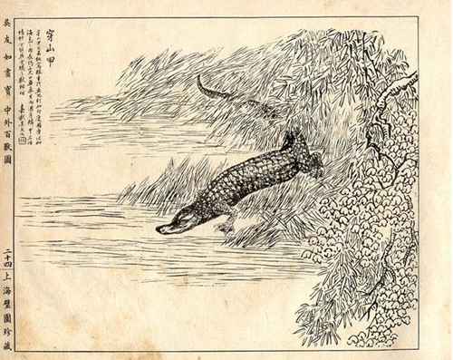《山海經(jīng)》記載的說(shuō)鯥其狀如牛,所以《山海經(jīng)》的插圖都把鯥畫成牛的樣子,到明清時(shí)期直到晚清時(shí)期的一些畫里面,又把穿山甲畫得像揚(yáng)子鱷。為什么穿山甲后來(lái)又變成鱷魚了呢?這依然跟書的記載有關(guān)系,因?yàn)榈搅怂未院蟮墓艜隙颊f(shuō)穿山甲長(zhǎng)得像鱷魚一樣。宋代羅愿的《爾雅翼》說(shuō),“鯪鯉,四足,似鼉而膽小”,鼉就是揚(yáng)子鱷,南方人叫它豬婆龍,李時(shí)珍《本草綱目》也說(shuō),“鯪鯉,狀如鼉而小”,都把穿山甲比作揚(yáng)子鱷,所以后來(lái)的人畫穿山甲就畫成了鱷魚。大家看這兩幅畫,左邊這幅就是見于一本古書,一本明代古書,叫《三才圖會(huì)》,它里面就畫有穿山甲,你看它上面寫著“鯪鯉”,這是穿山甲,你看他畫的就一個(gè)爬行動(dòng)物嘛,與其說(shuō)是穿山甲,不如說(shuō)更像鱷魚。