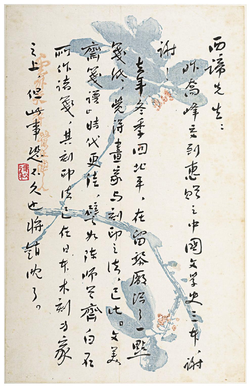 魯迅的書信主要用毛筆書寫,其中最值得稱道的是用毛筆寫在花箋宣紙上的信函,完全是一派傳統(tǒng)文化人之間的敬稱與謙和,紙短情長,溫文爾雅,筆墨如行云流水,或酣暢淋漓,或圈改涂鴉,松香墨跡,宣紙柔韌,襯托國畫花鳥圖案簡潔背景勾勒,筆走其間,有如穿越花草,隔空對話。并且,魯迅字體端莊秀麗,意蘊深厚,從容不迫,素凈雅致,書寫在有質感、有美感的特制信箋上,讓人望而脫俗,澄凈心懷。在魯迅的往來書信中,享有如此規(guī)格的受箋者并不多,給鄭振鐸(西諦)、趙家璧的信箋,都是表達崇高敬意和深厚謝意的。其次是書寫在黃傘格宣紙,再次是白凈宣紙上的信箋,都可以感受到紙凈墨香的素雅品質。后來,用鋼筆、圓珠筆寫在單位辦公用紙上的信件,那就是又當別論了。