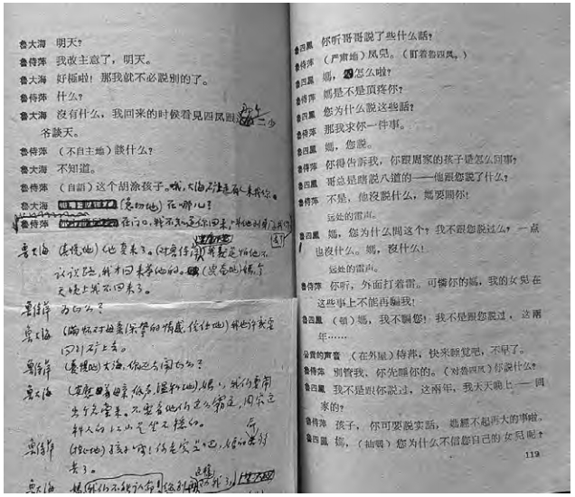 而曹禺在1950年代的戲劇修訂比茅盾更為曲折、反復(fù)。在1951年開(kāi)明書(shū)店出版《曹禺選集》時(shí),曹禺不僅刪去了上述“付印本”所刪的自然主義傾向的描寫(xiě)內(nèi)容,更對(duì)《雷雨》做了幾乎面目全非的大改,把第四幕全部改寫(xiě),人物命運(yùn)完全改變,然而這種傷筋動(dòng)骨的修訂顯然是很不成功的,并未得到讀者和觀眾的認(rèn)可,所以在1954年人民文學(xué)出版社出版《曹禺劇本選》時(shí),曹禺又極力向1930年代的版本靠近,而1957年中國(guó)戲劇出版社的戲劇一版《雷雨》也非常接近1954年“人文劇本選”版??墒牵S著周揚(yáng)所代表的主流文藝評(píng)論對(duì)自然主義的一再批判,隨著1958年八屆二中全會(huì)對(duì)“革命現(xiàn)實(shí)主義和革命浪漫主義相結(jié)合”的明確提倡,對(duì)自然主義的再次批判,曹禺在1959年修訂劇本時(shí),又有了僅次于1951年修訂幅度的大面積修改,而這次尤其注重了人物小傳的自然主義傾向的清除。