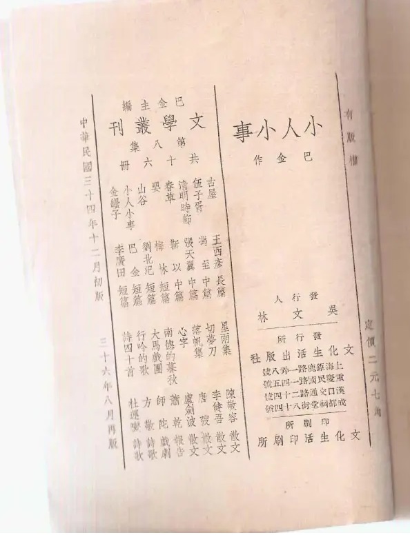 全面抗戰(zhàn)勝利后,巴金回到上海,重新整理自己的作品。于是把桂林文生社初版《小人小事》一分為二,“第一輯旅途通訊”三篇抽出,編入一九四六年四月萬葉書店初版《旅途雜記》?!暗诙嬓∪诵∈隆比?,再加上后來新寫的《女孩與貓》《生與死》兩篇,組成一本新的短篇小說集,書名仍沿用“小人小事”不變,這就產(chǎn)生了一九四五年十二月文化生活出版社初版的新的《小人小事》。