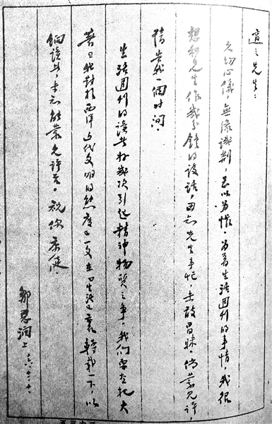 久切心儀,無緣識(shí)荊,至以為悵。為著《生活》周刊的事情,我很想和先生作幾分鐘的談話。因知先生事忙,未敢冒昧。倘蒙見許,請(qǐng)告我一個(gè)時(shí)間。