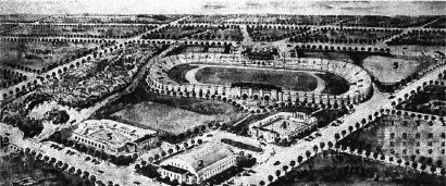 進入內場,茅盾所看到的田徑場像一個“圓城”,“仰之彌高”的看臺就是斜坡形的“城墻”,站在最高一級,就是站在“城墻頂上”了。俯瞰下面的“城圈子”里,正有廣東隊與山東隊兩支足球隊在緊張比賽中。