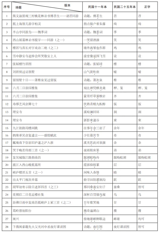 在《續(xù)集》部分,也即宣統(tǒng)元年至民國(guó)十年共13年所作的877題詩(shī)歌中,民國(guó)十一年本與民國(guó)二十五年本相較,共有31處異文,前者正確僅5處,正確率只有16%,后者正確29處,正確率高達(dá)94%。