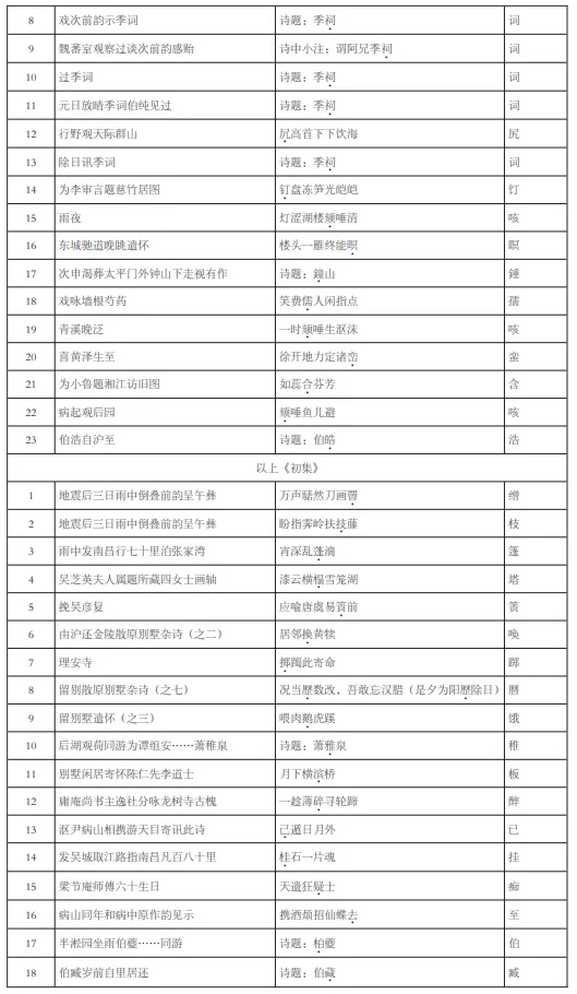 盡管是“原本縮印”,國(guó)難后這一版《散原精舍詩(shī)》除了訂正訛誤之外(詳后),還有許多變化。一是刪去原《初集》《續(xù)集》的鄭孝胥兩序,并以排印字體取代鄭孝胥的題名。撤刪鄭序、鄭字并非出于陳三立之意愿,而是出版方行為[55]。鄭孝胥于民國(guó)二十一年3月出任新成立的偽滿洲國(guó)國(guó)務(wù)總理,淪為民族罪人,牢記“國(guó)難”的商務(wù)自然不會(huì)保留鄭序、鄭字。二是《別集》部分較民國(guó)二十年刊本增補(bǔ)詩(shī)作14題,附于《別集》最后,依次為:《拔可寄示晚翠軒遺墨,展誦黯然,綴一絕歸之》(1935)、《題弢庵師與詒書(shū)學(xué)政合影》(1935)、《挽弢庵師》(1935)、《蘉庵訪我匡廬山居,得觀所攜桐城姚先生日記》(1932)、《和蒼虬(同心畬、叔明、立之、伯夔、君任作)》(1934)、《題匑庵〈墨謔庼畫(huà)隱圖〉》(1936)、《〈上方山圖〉,蘅屬題》(1934)、《蜜蜂畫(huà)社〈當(dāng)代名家畫(huà)?!怠罚?931)、《題王啟之〈霜荼閣圖〉》(1932)、《李苦李畫(huà)象》(1932)、《題陸丹林〈紅樹(shù)室圖〉》(1932)、《靖陶屬題〈昆明艷泛圖〉》(1933)、《蘅至匡山,攜示〈移居圖〉卷,為破戒綴一絕紀(jì)之》(1933)、《訒盦至廬山,過(guò)我松門(mén)別墅,手?jǐn)y〈填詞圖〉屬題,為破戒綴句以紀(jì)因緣》(1933)。民國(guó)十九年暫時(shí)移居九江之后,陳三立基本處于戒詩(shī)狀態(tài),所作甚少,多為應(yīng)屬之作,亦不存稿。此14題除數(shù)首為陳三立“勉于紙堆中覓得”者外[56],大多由商務(wù)編輯(或即李宣龔)輯錄自《國(guó)聞周報(bào)》的《采風(fēng)錄》專(zhuān)欄,此欄被吳宓譽(yù)為現(xiàn)代“中國(guó)舊體詩(shī)之最后逋逃藪”[57],主持者乃曹蘅。增補(bǔ)的14題詩(shī)作中,《蘉庵訪我匡廬山居,得觀所攜桐城姚先生日記》《和蒼虬(同心畬、叔明、立之、伯夔、君任作)》兩篇未見(jiàn)于《國(guó)聞周報(bào)》,似為陳三立“勉于紙堆中覓得”者。增補(bǔ)詩(shī)作排序十分混亂,未能編年(各詩(shī)寫(xiě)作年份見(jiàn)上錄詩(shī)題后),大概未經(jīng)陳三立手訂;《蜜蜂畫(huà)社〈當(dāng)代名家畫(huà)?!怠芬辉?shī)系其二子隆恪代作[58],亦予收錄,可為增補(bǔ)之詩(shī)未經(jīng)陳三立手訂之一證。