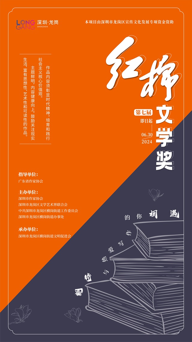 第七屆“紅棉文學(xué)獎(jiǎng)”是深圳市龍崗區(qū)宣傳文化發(fā)展專項(xiàng)資金資助項(xiàng)目,由廣東省作家協(xié)會指導(dǎo),深圳市作家協(xié)會、龍崗區(qū)文學(xué)藝術(shù)界聯(lián)合會、中共深圳市龍崗區(qū)橫崗街道工作委員會、深圳市龍崗區(qū)橫崗街道辦事處聯(lián)合主辦,真誠歡迎所有漢語寫作者踴躍投稿。