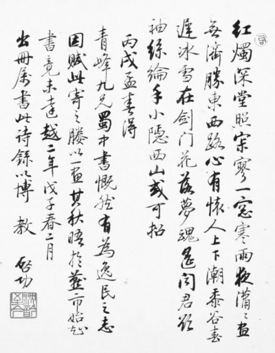啟功先生在《啟功口述歷史》中,曾深情回憶到祖父教他念詩(shī)時(shí)候的場(chǎng)景,而且少年時(shí)便開(kāi)始學(xué)寫詩(shī),曾有《社課詠春柳四首擬漁洋秋柳之作》等少作,且轉(zhuǎn)益多師,終生不廢吟誦。其生平舊體詩(shī)作,結(jié)集有《啟功韻語(yǔ)》《啟功絮語(yǔ)》《啟功叢稿·詩(shī)詞卷》等。并有《詩(shī)文聲律論稿》這樣的精深專著。啟先生1946年贈(zèng)給柴先生的這首詩(shī)作,不論是遣詞造句,以及用典等,無(wú)不顯示出其深厚的舊體詩(shī)功底,而且寄托了對(duì)友人深摯的思念。作為啟先生老友的柴德賡先生,亦雅好舊體詩(shī),其詩(shī)稿至今尚存,并將收入商務(wù)印書館即將刊行的《柴德賡全集》中。柴、啟兩先生,除了平日砥礪學(xué)術(shù),還互相詩(shī)酒唱和,這從啟先生《次韻青峰吳門見(jiàn)懷之作》、柴先生《寄懷元白兄》等作即可看出。而他們之間的深厚友誼,則貫穿了整整一生。